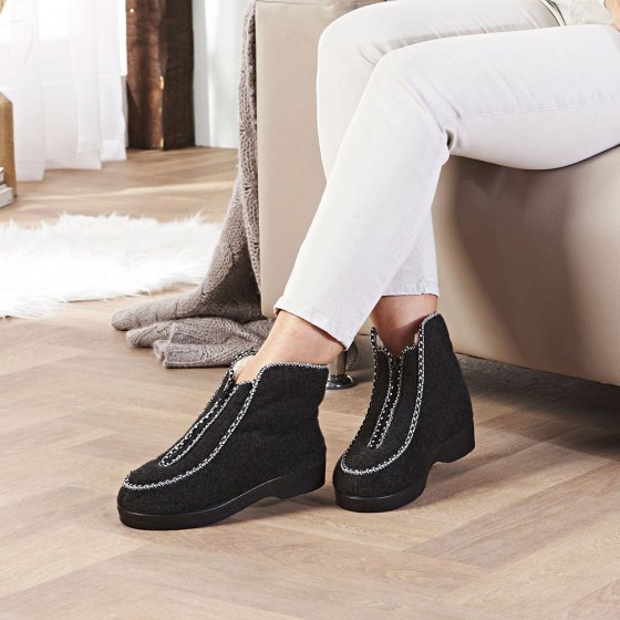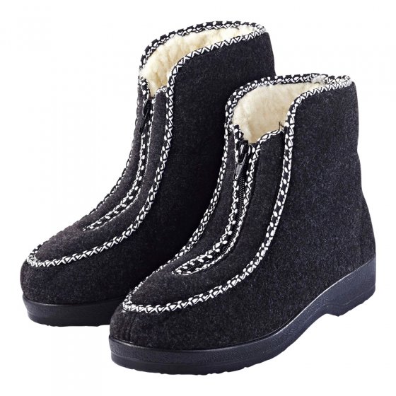 Perfekt für kalte Tage. Das wärmende Innenfutter aus Schurwolle und das robuste Aussenmaterial aus Filz machen diesen Schuh zum idealen Begleiter für zu Hause. Die rutschfeste Gummi-Laufsohle und der hohe Schaft bieten zusätzlichen Halt und Komfort. Besonders praktisch ist der Reißverschluss, welcher das An-und Ausziehen erleichtert, sowie eine individuelle Anpassung an die Füße ermöglicht. Futter: 100 % Schafwolle.