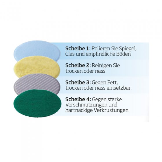 Putzen oder putzen lassen? Keine Frage: der AUFLADBARE 360°-MOPP erledigt die Reinigung fast wie von selbst für Sie! Seine Wischfläche rotiert etwa 200 Mal pro Minute um 360° und rückt so allen Verschmutzungen mühelos zu Leibe. Dank seiner 4 Microfaser-Scheiben ist er für nahezu jede Oberfläche geeignet. Polieren Sie Spiegel oder lackierte Flächen, reinigen Sie Fliesen und Linoleum oder verleihen Sie Ihrem Parkett neuen Glanz – ganz ohne Kraftaufwand oder störendes Kabel! Der Stiel ist abnehmbar, so dass Sie damit Fenster putzen oder sogar Autos polieren können. Dank des mitgelieferten Netzteils ist der aufladbare Akku stets einsatzbereit. Ø = ca. 23 cm, Länge Stiel: ca. 111 cm. Der richtige Dreh für alle Flächen!