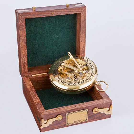 Le CADRAN SOLAIRE AVEC BOUSSOLE tient dans la main comme une montre de poche. Mais l’aiguille repliable (gnomon) révèle qu’il s’agit d’un instrument de mesure, tel que les grands navigateurs l’utilisaient jadis. L’ombre portée sur la bague du couvercle indique l’heure, la boussole détermine la latitude. En pressant l’œillet de la bague, le couvercle s’ouvre et vous pouvez admirer la belle mécanique intérieure avec l’aiguille de la boussole. Version lourde en laiton. Dimensions env. 25 x Ø 73 mm. Superbe travail artisanal, totalement fonctionnel ! Livré dans un luxueux étui en bois avec des ferrures en laiton. Un objet rare qui va faire battre le cœur des collectionneurs d’articles maritimes rétro !