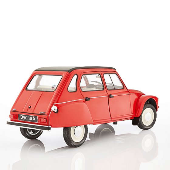Es ist kein Zufall, dass die Dyane äußerlich stark an die legendäre „Ente“ von Citroën erinnert: Nachdem die 2CV-Verkäufe Mitte der 60er-Jahre stark zurückgegangen waren, schob Citroën 1967 die Dyane nach. Sie war etwas größer, etwas stärker (28–32 PS) und hatte eine größere Heckklappe – trotzdem erlangte sie nie den Kultstatus des 2CV. 1973 endete die Produktion wieder, während die „Enten“-Produktion noch bis 1990 lief. Das 1:18-Modell CITROËN DYANE 6 erinnert an dieses technisch gute Fahrzeug, das heute als Geheimtipp unter Oldtimer-Fans gilt. Die Vordertüren sind aufklappbar, die Lenkung ist funktionstüchtig. Maße (L x B x H): ca. 22 x 8 x 9 cm. Sichern Sie sich die optimierte „Ente“ für Ihre Sammlung!