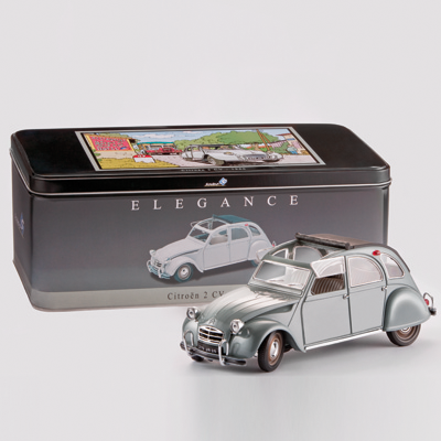 Für Sammler und Nostalgiker, die Tausende von Kilometern an seinem Lenkrad zurücklegten, haben wir hier ein Modell im Maßstab 1:18 des CITROEN 2CV aus dem Baujahr 1966. Als der damalige französische Staatspräsident Vincent Auriol am 07. Oktober 1948 den Pariser Autosalon betrat, rechnete er nicht damit, am Stand von Citroen Zeuge der Geburt einer Legende zu werden. Unter dem Decknamen „TPV“ (très petite voiture: sehr kleines Auto) hatten die Konstrukteure den 2CV kreiert, das „Auto für Jedermann“. Dieses ungewöhnliche Auto war in der Lage, 2 Personen und 50 kg Kartoffeln bei 60 km/h und einem Verbrauch von nur 3 Liter auf 100 km zu transportieren. Bei dieser sehr aufwändig gefertigten Nachbildung mit einer Karosserie aus Metallspritzguss wurde kein Detail übersehen: Lenkbare Vorderachse, Motorhaube zum Öffnen und authentischer Federung. Länge ca. 23 cm. Lieferung als Sonderedition in repräsentativer Metallschatulle.
