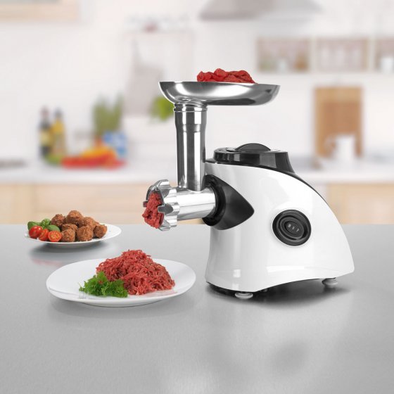 Rien ne vaut le fait maison : avec le HACHOIR À VIANDE / MIXEUR 2 EN 1 vous avez un appareil compact qui vous permet de faire de la viande hachée, de la chair à saucisse et des kébbés en un tournemain ! Le moteur puissant de 450 watts hache et mélange sans peine la viande, le poisson ainsi que les légumes cuits. Les 3 grilles à trous de différents diamètres pour hacher fin, moyen ou gros, permettent d’obtenir la consistance souhaitée pour toutes sortes de viandes. Mais ce n’est pas tout, car cet appareil compact a d’autres talents et vous pouvez vous en servir pour réaliser de délicieux milk-shakes et smoothies dans le bol mixeur en verre. Dimensions (P x l x H) : env. 27 x 23 x 44 cm. Fonctionne sur secteur 230 V. Livré avec adaptateur pour saucisses, kébbés et poussoir. Avec cet appareil, vous faites concurrence à votre boucher !