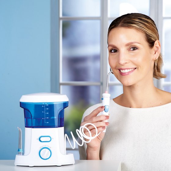 Brosser ses dents à la brosse ne représente que la moitié de l'hygiène buccale. Pour accéder aux espaces interdentaires, des outils efficaces existent : comme cet HYDROPULSEUR KOMBI-PRO. Beaucoup plus efficace que du fil dentaire et polyvalent : huit pulvérisateurs permettent un nettoyage approfondi des appareils dentaires, de la langue mais également des prothèses dentaires. La pression exercée par le jet d'eau pulsé (1200 impulsions par minute) est réglable (de 30 jusqu'à 125) – selon le cas, si l'on désire seulement masser la gencive ou ôter des résidus. Fonctionne sur secteur, 230 V. Dimensions (l x H x P) : env. 15 x 11 x 10 cm. Une hygiène buccale irréprochable par simple pression sur un bouton ? Rien de plus simple !