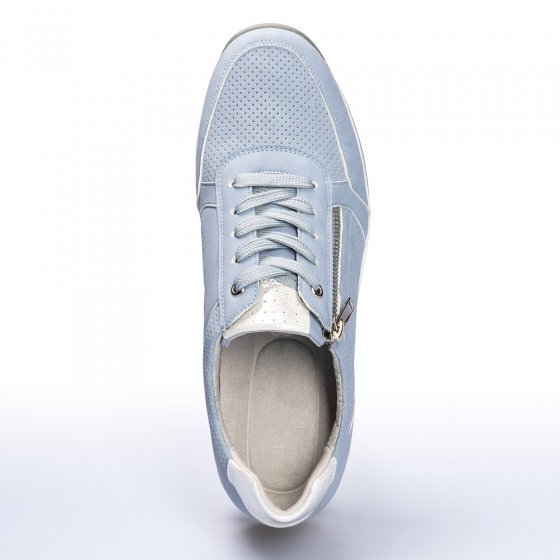 Sportlicher Sneaker in Veloursleder-Optik, außen mit Reißverschluss für den schnellen und bequemen Ein- und Ausstieg, daher müssen die Schnürsenkel nur einmalig gebunden werden. Mit weicher, herausnehmbarer Decksohle und rutschhemmender, modischer Laufsohle. Standardweite G. Material: veganes Leder, Farben: Blau, Flieder.