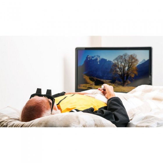 Fernsehen im Liegen ist eine bequeme Sache – sofern man den Kopf nicht anheben muss, um das Fernsehbild sehen zu können. Leider ist das beim Fernsehen im Bett praktisch immer der Fall: Nur mit angewinkeltem Kopf bzw. mit einer Vielzahl von Kissen im Nacken kann man horizontal geradeaus gucken. Verspannungen sind vorprogrammiert! Bequemer geht’s mit der PERISKOP-LIEGEBRILLE: Über ein Spiegelsystem wird der Blick um 90 Grad umgelenkt – wer auf dem Rücken liegt und eigentlich zur Decke schaut, blickt mit der Brille also tatsächlich nach vorn. Die Periskop-Brille ermöglicht das bequeme Lesen, Fernsehen oder Nutzen eines Tablet-PCs in Liegeposition. Der Clou: Das Gestell ist so geformt, dass die Periskop-Brille auch über einer „richtigen“ Brille getragen werden kann. Ideal für bettlägerige Personen! Gestellbreite: ca. 15,7 cm. Lehnen Sie sich im wahrsten Sinne zurück – und genießen Sie Fernsehen in vollkommen entspannter Haltung!