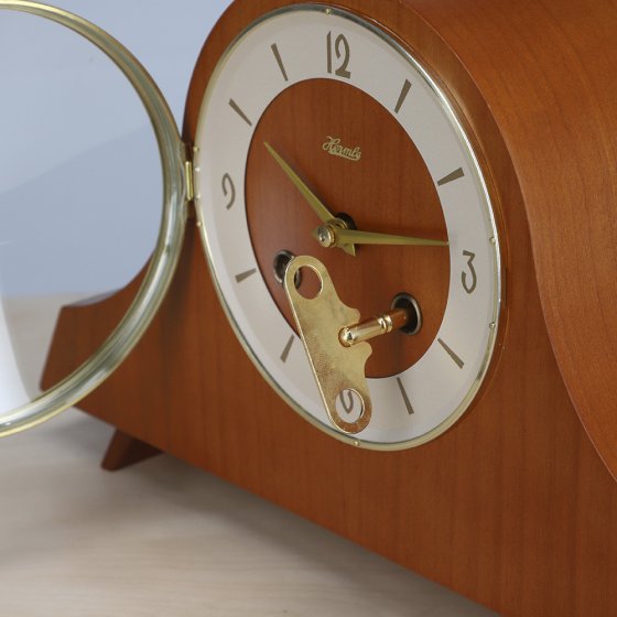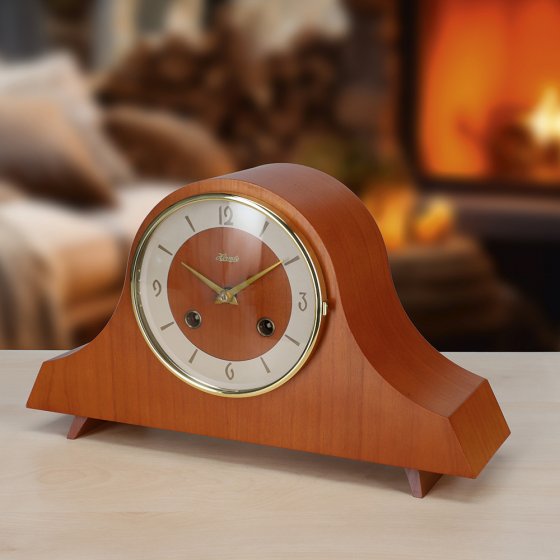 Sogenannte „Napoleon-Uhren“ machen vor allem auf Kaminsimen und Kommoden eine gute Figur – dort kommt ihre hügelartige Gehäuseform, der sie ihren Namen verdanken, besonders gut zur Geltung. (Die Form erinnert an den Militärhut von Napoleon Bonaparte.) Die MECHANISCHE KAMINUHR „NAPOLEON“ ist eine sehr schöne Vertreterin ihrer Gattung: Ihr cremefarbener Zifferblattring passt wunderbar zum hellbraunen Kirschbaumholz des Gehäuses. Rückwand und Zifferblattabdeckung sind aufklappbar; man kann die Zeigerstellung also von Hand korrigieren. Mechanisches Aufzugswerk mit Stundenschlag (Stundenzahl) und Halbstundenschlag (Doppelschlag). Maße (L x B x H): ca. 31 x 19 x 9 cm. Werten Sie Ihr Wohnzimmer historisch auf!