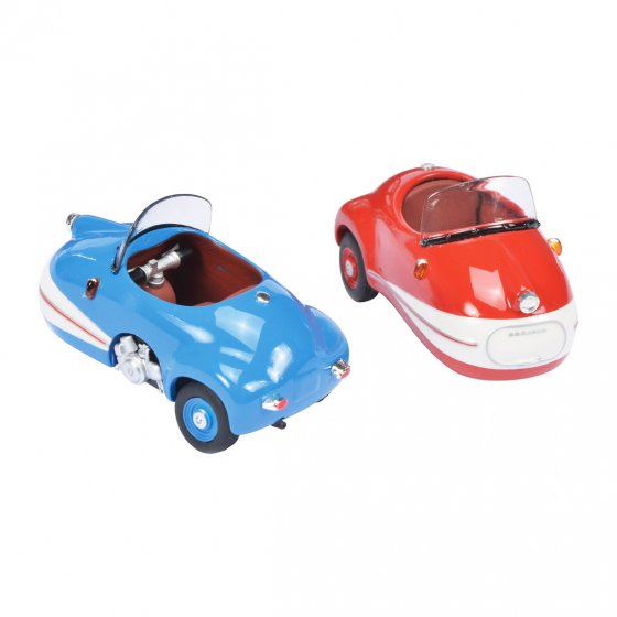 Es gab im Laufe der Automobilgeschichte nur wenige Fahrzeuge, die den Titel „kleinstes Auto der Welt“ für sich in Anspruch nehmen durften. Eines der urigsten war die von Egon Brütsch konstruierte Mopetta: Sie war nur rund 70 kg schwer und konnte somit als Reisegepäck auf dem Dach einer Limousine mitgenommen werden! Beim limitierten Modell MERCEDES BENZ 170V „MOPETTA“ thronen gleich 2 (abnehmbare) Mopettas auf dem meistgebauten Mercedes der Vorkriegszeit. Der MB 170V ist aus Zinkdruckguss, die Mopettas aus Resin. Maße (L x B x H): Mercedes ca. 10 x 4 x 5 cm, Mopetta (je Exemplar) ca. 4 x 2 x 2 cm. Sichern Sie sich diese ungewöhnliche Dreierkombination für Ihre Sammlung!
