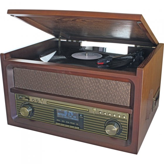 Eine Messeneuheit schon jetzt im Katalog! In dieser Musikanlage, deren Design an die 50er Jahre erinnert, steckt viel mehr moderne Technologie, als man ihr auf den ersten Blick zutraut: Mit diesem MUSIKCENTER MIT DAB+ UND AUFNAHMEFUNKTION speichern Sie nicht nur von Schallplatte, CD und Kassette auf einen USB-Stick, sondern auch direkt vom DAB+/UKW-Stereo PLL-Radio! Plattenspieler (33/45/78 U/min.) mit Tonarmlift, programmierbarer CD-Player, Kassettendeck, LC-Display, Fernbedienung und eingebaute Stereo-Lautsprecher (2 x 50 Watt) im ca. 32 x 47 x 21 cm (L x B x H) großen Gehäuse mit Echtholzoberfläche. Eine tolle Anlage, mit der Sie von den Möglichkeiten innovativer Technologie profitieren und rausch- und knisterfreies DAB+-Digitalradio genießen können.