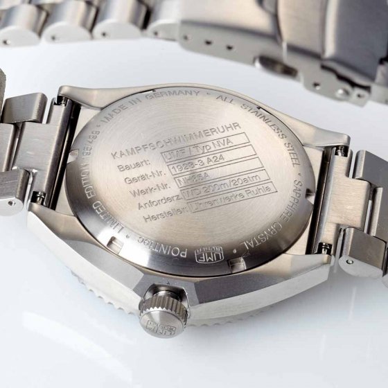 Die NVA-KAMPFSCHWIMMER-UHR „EDITION 5“ ist eine Neuauflage jener Uhren, die zur Ausrüstung der maritimen Spezialeinheit KSK-18 in der ehemaligen DDR gehörten. Zum Aufgabenspektrum dieser Einheit gehörten vor allem Tauchoperationen – deshalb genügt die Uhr höchsten Druckresistenz- und Wasserdichtigkeitsansprüchen (20 ATM). Sowohl die Zeiger als auch die Indizes sind fluoreszierend, damit sich die Uhrzeit auch nachts gut ablesen lässt. Die Zifferblattabdeckung ist selbstverständlich aus kratzfestem Saphirglas. Uhrwerk: Automatik (Seiko). Maße: Ø ca. 43 mm, Gehäusestärke ca. 14 mm. Sie schätzen hochwertige Uhren, die etwas aushalten? Dann lautet das Kommando: Zugriff!