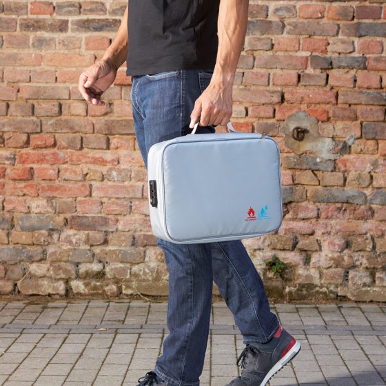 Les effets personnels les plus importants – titres de propriété, passeports, contrats – devraient être conservés dans un endroit sûr où ils resteront bien ordonnés et seront prêts à emporter en cas d'évacuation. Le PORTE-DOCUMENTS RÉSISTANT À L'EAU ET AU FEU est idéal pour cet usage : en cas d'incendie, il résiste à la chaleur jusqu'à 550 °C. Le matériau en trois couches est aussi imperméable et ne craint pas les éclaboussures d'eau d'extinction. Une serrure à combinaison empêche l'ouverture par des personnes non autorisées. À l'intérieur se trouvent divers compartiments bien ordonnés, dont 4 pour passeport, 16 pour cartes, 4 pour supports de mémoire, ainsi que 6 poches filet (certaines zippées). Dimensions (L x l x H) : env. 36 x 27 x 10 cm. Un système de rangement ingénieux qui vous aidera à récupérer les objets essentiels même après un incendie.
