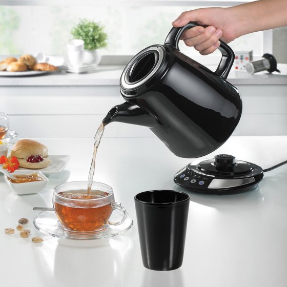 Wenn Sie gerne Tee trinken oder öfter heißes Wasser für Aufgussgetränke benötigen, werden Sie von dem PORZELLAN-TEE- UND WASSERKOCHER begeistert sein: Er kann auf 5 verschiedene Temperaturen eingestellt werden (60/70/80/90/100 °C), je nach bevorzugter Brühtemperatur. Die Einstellung erfolgt über die Basisstation. Außerdem hat der Kocher eine Warmhaltefunktion, die den Tee oder das Wasser bis zu 2 Stunden lang warmhält. Mit herausnehmbarem Teesieb. 230 V, 1.380 W. Füllmenge: 850 ml. Maße (B x H x T): ca. 24 x 22 x 19 cm. Mit dem Kocher aus schwarz-glänzendem Porzellan können Sie nicht nur Ihr Heißgetränk, sondern auch das Aufbrühen genießen!