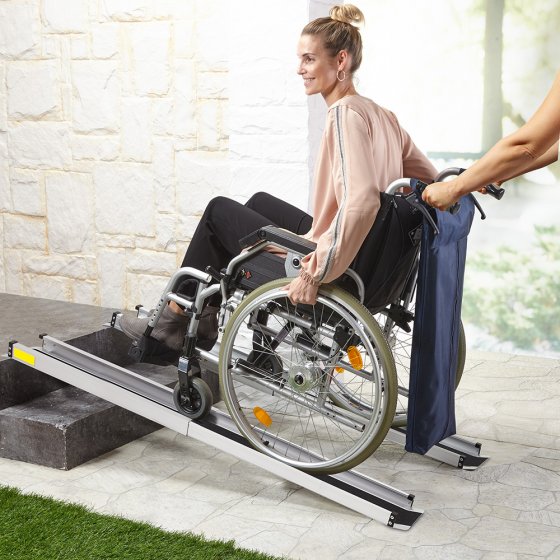 Les marches, seuils de porte et coffres de voiture élevés sont autant d’obstacles qui rendent le transport ou le chargement de fauteuils roulants difficiles. Avec son poids léger, la rampe pour fauteuil roulant est idéale pour la maison et les déplacements. Elle supporte un poids de 270 kg et est facile à installer. Quelques gestes suffisent pour la replier en vue du transport. Lot de 2. Matière : aluminium. Couleur : argent, noir. Poids : 6,4 kg (2 pièces). Dimensions (largeur ; longueur) : 15 cm; 1,52 m, 79 cm (repliée). Livré dans un sac de transport pratique.