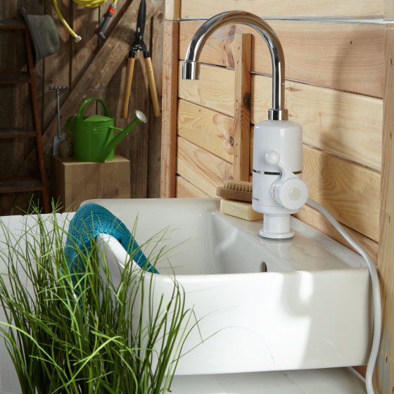 À la cave, au WC, dans le garage ou la cabane de jardin… il n’y a pas toujours d’eau chaude partout où on en a besoin. Maintenant, ça va changer, grâce au ROBINET CHAUFFE-EAU INSTANTANÉ. Il est mobile, s’installe rapidement sur un lavabo avec un raccord de 3/4 de pouce (ou à l’aide d’adaptateurs ordinaires disponibles dans le commerce), et procure de l’eau chaude en quelques secondes. Il suffit pour cela de le brancher sur une prise de courant ! La glissière permet de régler la température de l’eau en continu de "froid" à "chaud". Le robinet tourne sur 360°, ce qui permet de remplir facilement les doubles lavabos. Dimensions (l x H x P) : env. 10 x 39 x 18 cm. Enfin de l’eau chaude là où vous en avez besoin !