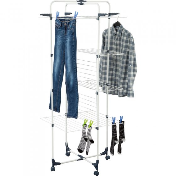 Quand on fait plusieurs lessives à la suite, on manque souvent de place pour étendre le linge ! Ce n'est pas le cas avec le SÉCHOIR TOUR ! Il met à votre disposition 37 m de longueur d'étendage grâce à sa construction en hauteur. Des chaussettes aux torchons en passant par les pantalons longs et les chemises… il y a de la place pour tout. Son point fort : les 4 supports orientables du haut permettent d'accrocher 16 cintres supplémentaires ! Les éléments sont rabattables afin de faire de la place pour les vêtements longs ! Le séchoir est stable sur ses 4 roues munies de freins. Une fois replié, il se fait encore plus mince et se range sans encombrer. Matière : acier poudré/plastique. Dimensions (l x H x P) : env. 70 x 175 x 65 cm. Poids : env. 5,7 kg. Un séchoir vraiment génial !