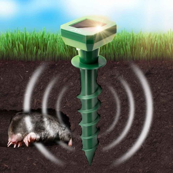 Wühlmäuse können einen Garten enorm schädigen: Sie benagen Wurzeln und Knollen und verunstalten Beete und Rasenflächen. Die SOLAR-WÜHLMAUSABWEHR schafft Abhilfe – denn der Spieß erzeugt Vibrationen, die wie seismische Wellen wirken. Wühltiere fühlen sich davon gestört und meiden die Region. Innerhalb von 24 Stunden wechselt der Spieß auch mehrfach das Vibrationsmuster, damit sich die Tiere nicht an das Brummen gewöhnen. Dank seines umlaufenden Schraubgewindes lässt sich das Gerät ganz leicht in die Erde einbringen; es „fräst“ sich praktisch wie von selbst ins Erdreich. Betrieb über Akku und Solarpanel. Maße je Spieß (Ø x L): ca. 7 x 27 cm. Sagen Sie Wühltieren den Kampf an!