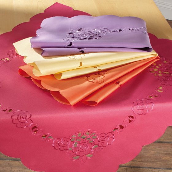 Donnez à votre table joliment dressée une belle note de couleur avec cette SURNAPPE À FLEURS BRODÉES ! Elle est très élégante avec ses broderies ton sur ton et son motif ajouré, et en prime facile d'entretien. Dimensions : env. 85 x 85 cm. 100 % polyester.