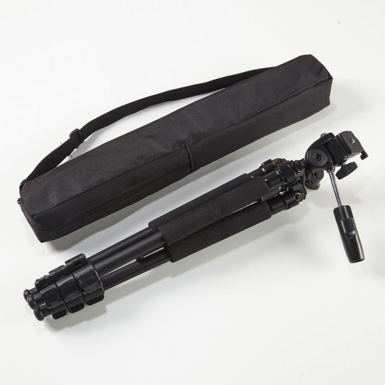 Dreibeinstativ mit schnelltrennbarer Grundplatte, schnelle Höhenverstellung (48–132cm) per Flip-Lockverschluss, gummierte, rutschhemmende Füße, perfekte Nivellierung mit integriertem Lot. Länge geschlossen ca. 50 cm, Gewicht ca. 850 g, Lieferung inkl. Tasche