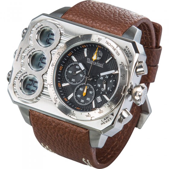 Als der Schuhmacher Nathan Swartz in den 50er-Jahren die Abington Shoe Company kaufte, ahnte er nicht, dass der 1973 eingetragene Markenname „Timberland“ einmal weltweit als namhafter Outdoorbedarfs-Hersteller bekannt wird. Ganz in diesem Sinne beeindruckt der TIMBERLAND CHRONOGRAPH schon von weitem durch sein massives Edelstahl-Gehäuse. Neben dem Rundinstrument mit Quarzuhrwerk enthält es eine dreiteilige Digitalanzeige (alle beleuchtet). Mit der Krone und 5 Drucktasten haben Sie Uhrzeit, Datum, Kalender, zweite Weltzeit, Alarm und Stoppuhr (analog/digital) bequem im Griff. Kratzfestes Mineralglas und ein Armband aus echtem Leder (23 cm) machen die Outdoor-Ausstattung der Uhr (L x B x H: 6,3 x 4,2 x 1,5 cm) komplett. Nicht nur für Liebhaber außergewöhnlicher Uhren.