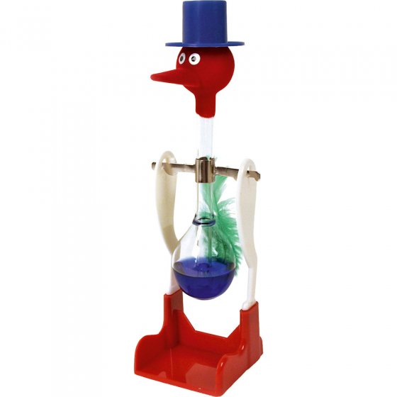 Es widerspricht allem Anschein nach den Gesetzen der Thermodynamik: Ohne erkennbare Energiezufuhr vollführt der TRINKVOGEL wippende Bewegungen – er „trinkt“ fortwährend aus einem vor ihm aufgestellten Gefäß mit Flüssigkeit. Dass die Bewegungen mit der Umgebungstemperatur zusammenhängen, ist auch für kluge Köpfe nicht leicht zu erkennen: Die ausgewählte Trinkflüssigkeit muss bei Raumtemperatur leicht verdampfbar sein (Wasser oder Spiritus). Maße (L x B x H): ca. 7 x 6 x 18 cm, zertifiziert nach EN71. Stellen Sie Freunde und Besucher vor ein spannendes Rätsel: Wieso wird der Vogel nicht „trinkmüde“?