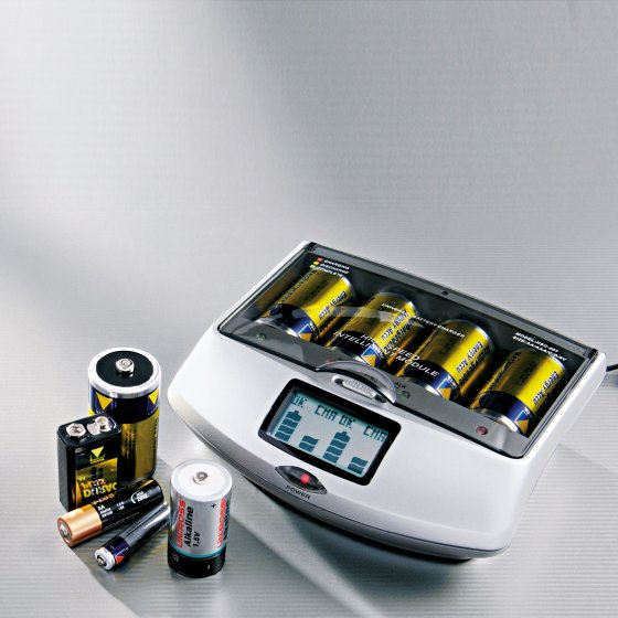 Das ’’intelligente’’ UNIVERSELLE BATTERIELADEGERÄT lädt durch Spareffekt Ihre Kasse auf: Es ist für fast alle Batterien (AA, AAA, C, D, 9 Volt) geeignet und lädt nicht nur Ni-Cd- und Ni-MH-Akkus auf, sondern kann sogar Alkali-Einwegbatterien ’’auffrischen’’, wenn sie nicht vollständig entladen sind. Es kann mikroprozessorgesteuert bis zu vier Batterien gleichen Typs zeitgleich aufladen und superschnell Alkalibatterien in weniger als 2,5 Stunden auffrischen, Ni-MH-Batterien erfordern zwischen 45 Min. und sieben Stunden und Ni-Cd-Batterien je nach Typ 24 - 45 Min. Beleuchtete Anzeige. Netzadapter wird mitgeliefert. Maße: ca. 16 x 15 x 6 cm.