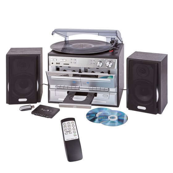 Wie Sie Ihre heiß geliebten Melodien „unsterblich“ machen? Ganz einfach mit dem USB-MUSIKCENTER! Es überspielt Ihre Lieblings-Hits von Platte, CD und MC auf USB oder SD-Karte. Und dank des Doppel-Kassettendecks können Sie auch von einer MC auf die andere kopieren. Schleichender Qualitätsverlust durch Kratzer, Bandsalat sowie empfindliche CDs können Ihren Aufnahmen nun nichts mehr anhaben, weil die Musik in exzellenter Qualität konserviert wird. Die vollwertige Stereoanlage (Maße ca. 32 x 29 x 29 cm) verfügt über zwei externe 2-Wege Lautsprecher mit 2 x 25 Watt Leistung. Dank ihres hervorragenden Klangs bereitet Ihnen diese Anlage viel Hörgenuss!
