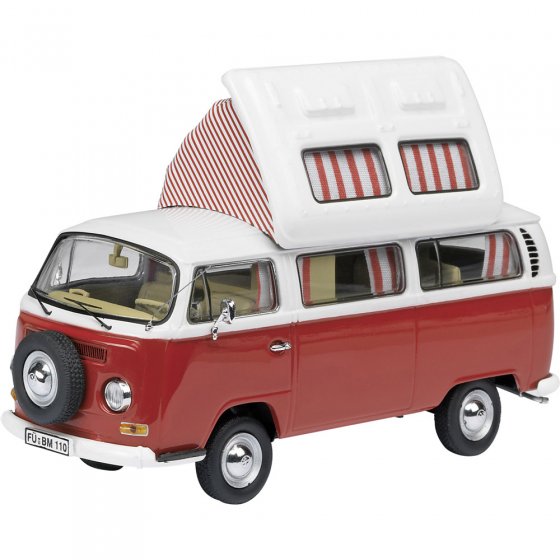 Im Jahr 1967 präsentierte VW die zweite Generation des Transportwagens T1. Der T2 war etwas größer als sein Vorgänger, hatte größere Fenster und ein deutlich besseres Fahrwerk. Im Heck brummte zwar noch immer ein luftgekühlter Boxermotor, aber der neue Transporter war eindeutig mehr Van als LKW. Man darf den T2 heute getrost als den „Urvater“ aller Großraumlimousinen ansehen. Das Modell des VW T2 CAMPINGBUS im Maßstab 1:18 besticht durch seine Funktionalität: Alles, was am großen Original zu öffnen ist, ist auch am Modell zu öffnen – vom Hochdach bis zur Motorklappe. Selbstverständlich hat die Seitentür eine Schiebvorrichtung; die Vorderachse ist lenkbar. Im Inneren gibt’s die komplette Camping-Ausstattung inklusive gestreifter Fenstervorhänge. Das Modell ist aus Zinkdruckguss gefertigt, die Anbauteile sind aus Kunststoff. Diese automobile „Einzimmerwohnung“, die Kleinfamilien zu Großausflüglern und Reiselustige zu Globetrottern machte, darf in keiner Sammlung fehlen! Sichern Sie sich schnell Ihr Exemplar!