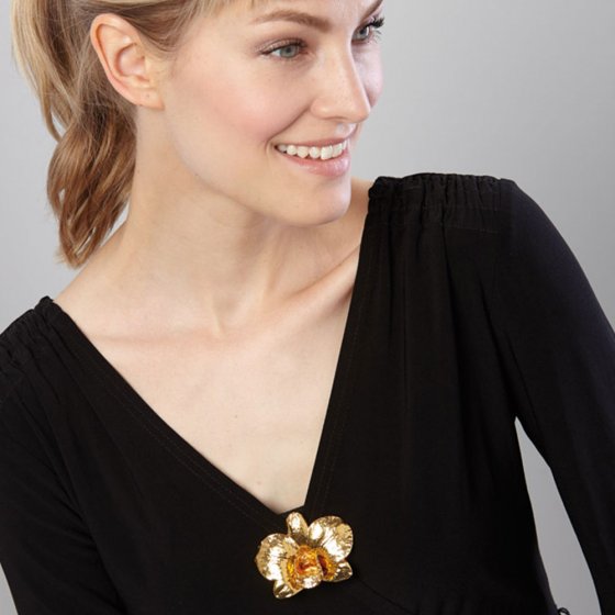 Schon seit mehr als 2500 Jahren fasziniert die Orchidee durch ihre geheimnisvolle Schönheit und Grazie. Im alten China galt sie als Symbol der Reinheit und Liebe... Kaum ein anderes Schmuckstück vermag Ihre Gefühle so auszudrücken wie diese VERGOLDETE ORCHIDEE. Dieser zauberhafte Anhänger ist aus einer echten Orchidee gefertigt, die in voller Blüte in ein Goldbad (24 Karat) getaucht wurde. Und weil eine jede natürliche Blume anders ist, ist auch jeder Anhänger ein Unikat! Misst ca. 5 x 4,5 cm, vergoldete Kette (mitgeliefert): 45 cm. Gönnen Sie sich und anderen eine kostbare Blume, die ewige Liebe zum Ausdruck bringt!